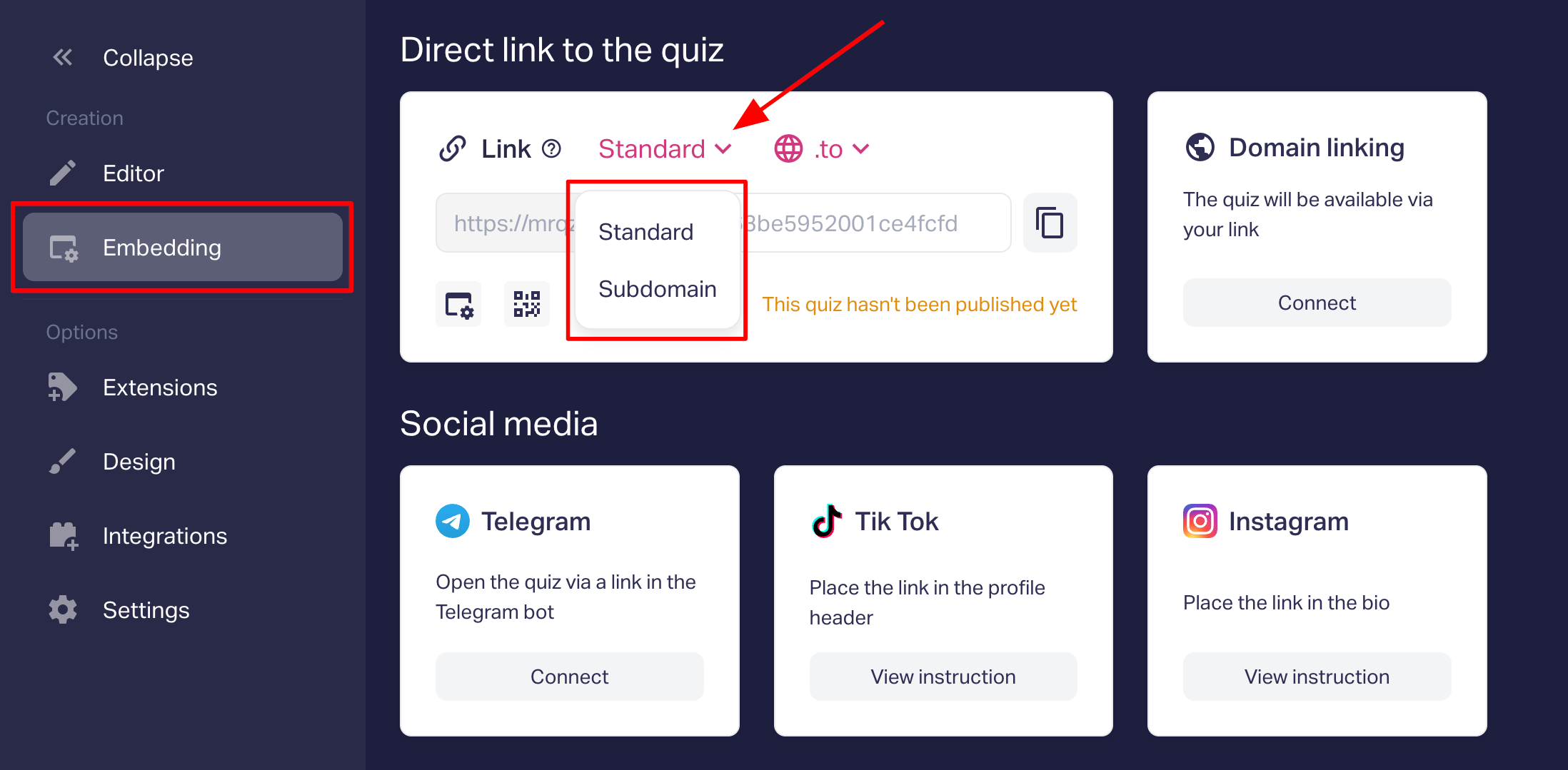 Next, in the “Direct link to the quiz” block, select the link type: Standard or Subdomain: