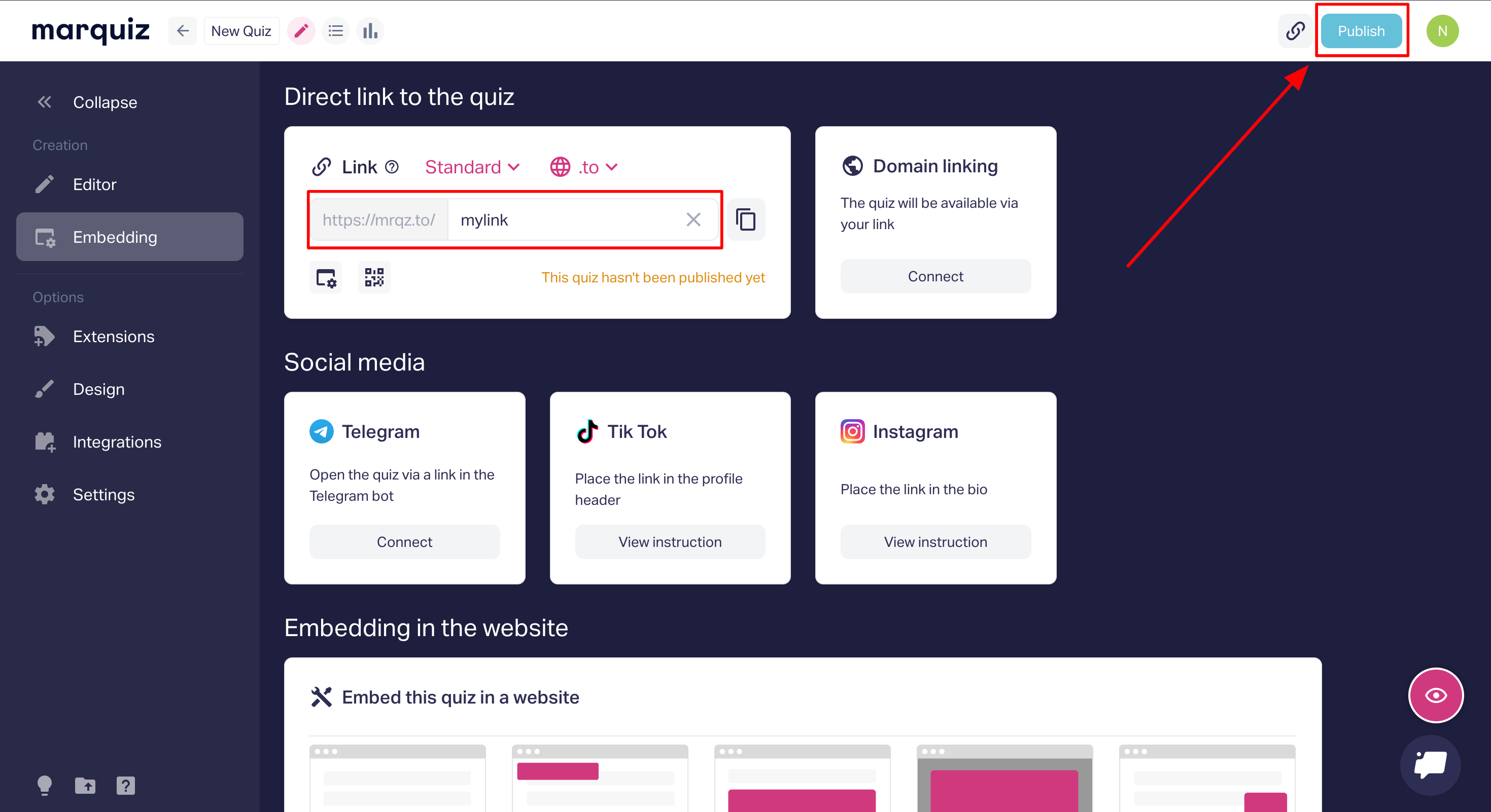To set a unique link to your quiz, you need to start editing your quiz and then open the “Embedding” tab.