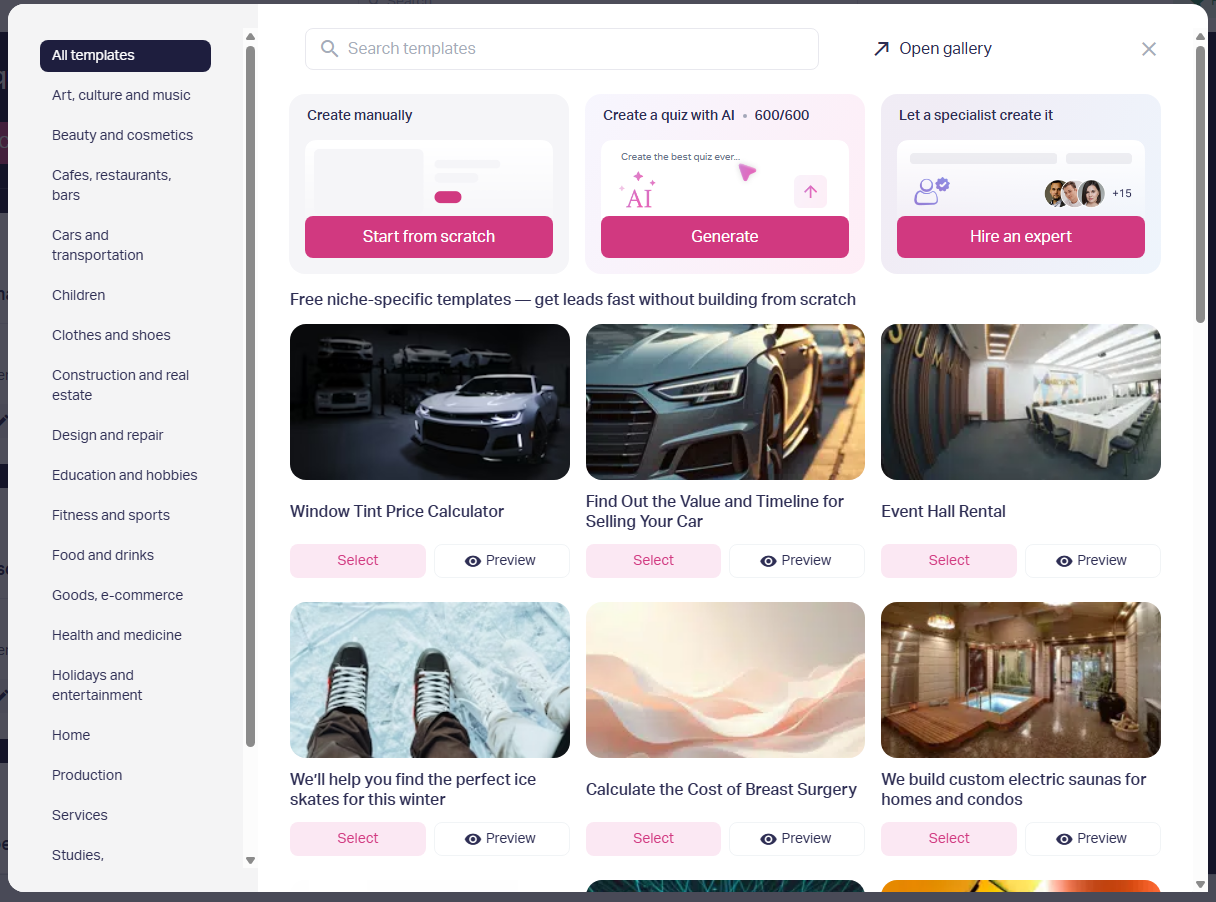 1. Go to your personal account on Marquiz and click "Create" -> choose one of the suggested templates, start creating everything from scratch or generate a template using AI.
