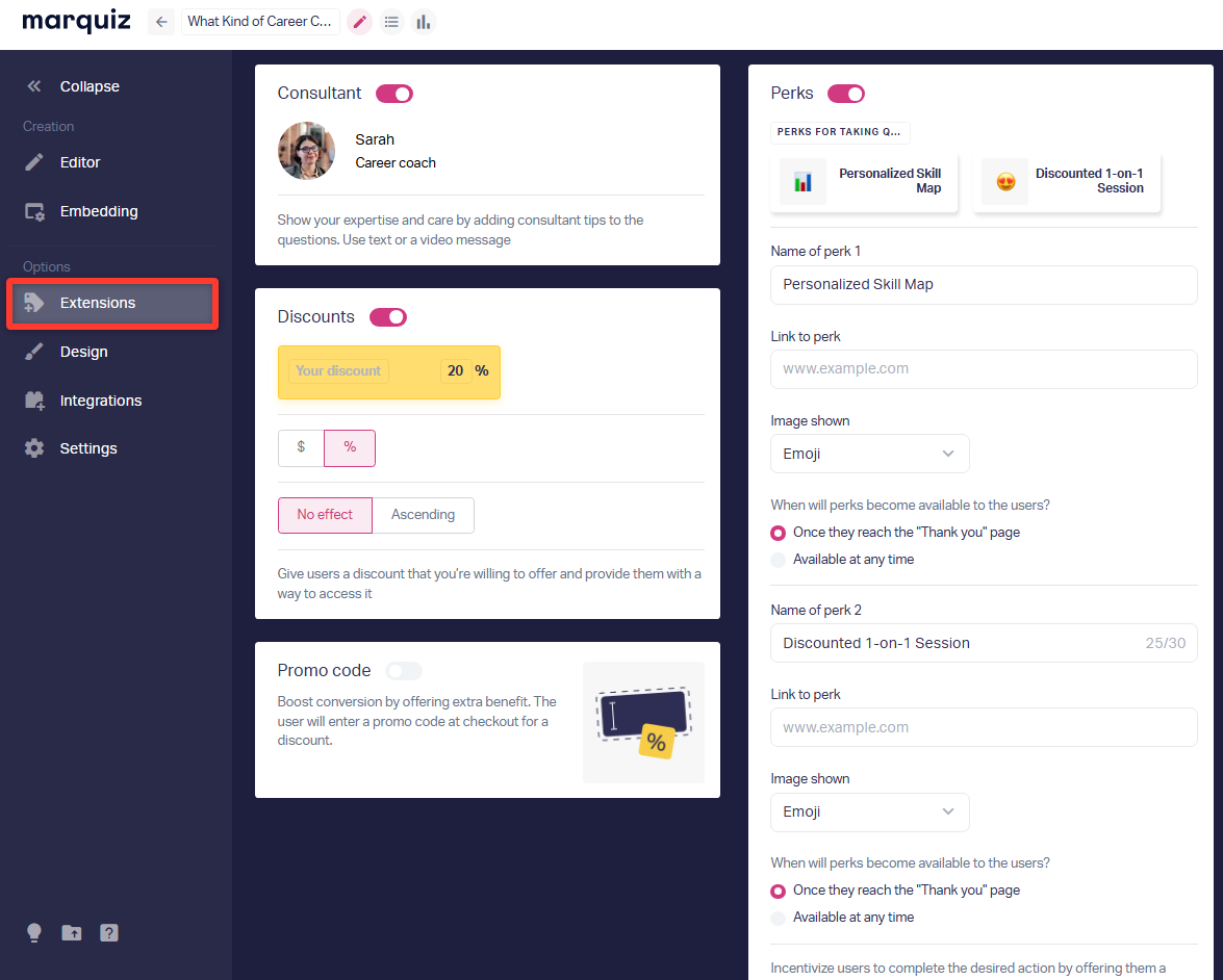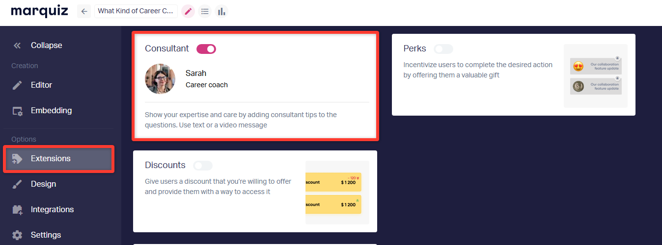 Add a photo, name, and position of the consultant (it will be displayed if there are comments on the questions) in "Extensions".