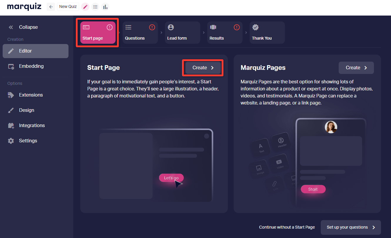 3. In the "Start page" section, click "Create".