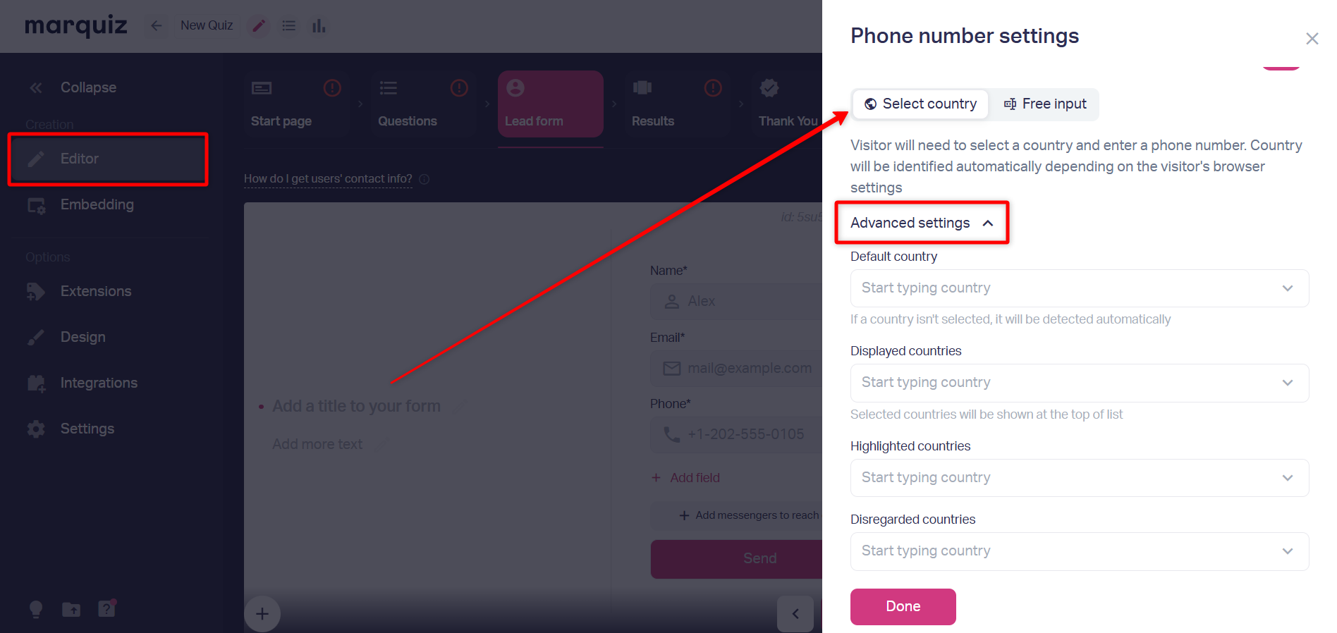 To set up a lead form, go the the quiz editor and choose the "Lead form" section.