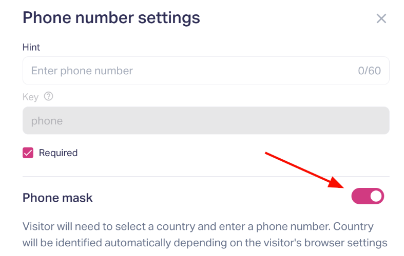 6. To make sure the phone number will be entered correctly, activate the phone mask in the phone field settings and set up countries to show as default, highlight, display, or disregard.