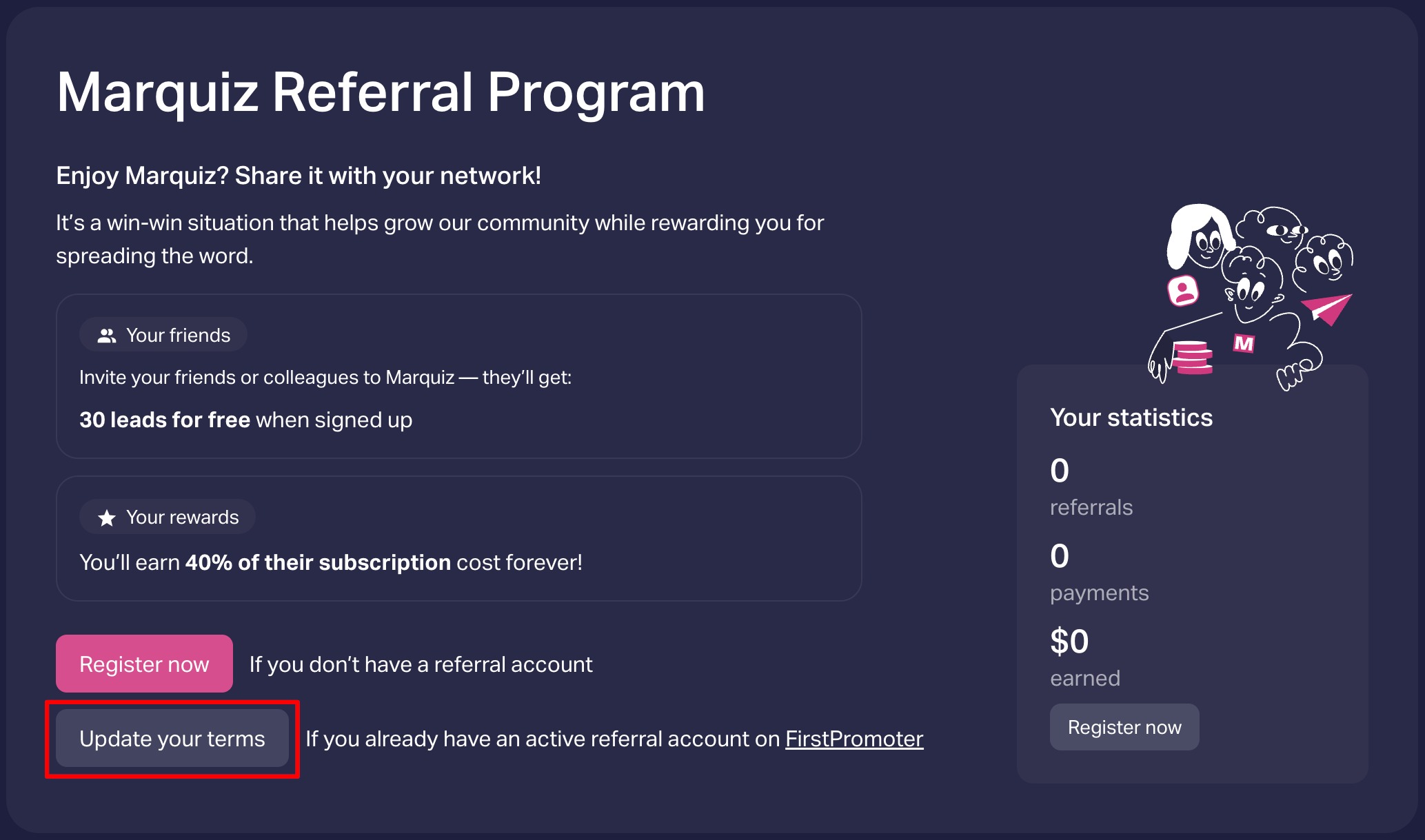 To withdraw funds from the affiliate program, contact us via live chat. To do so, click the hand emoji in the lower right corner of the marquiz.io website or on your account.