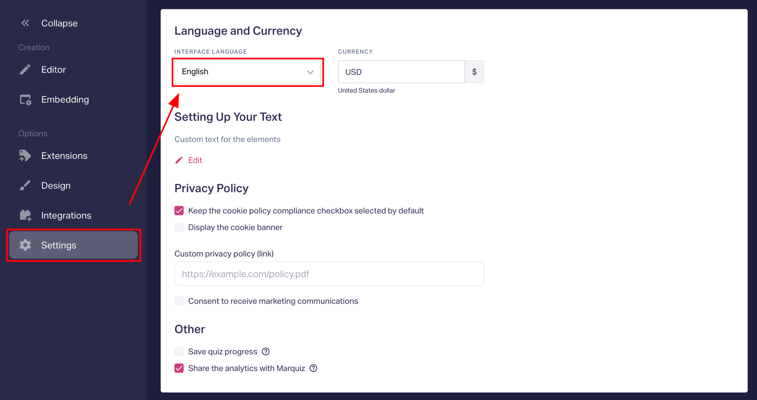 In order to change the quiz interface language you'll need to to go to the “My quizzes” tab select the desired quiz and click on the “Edit” button