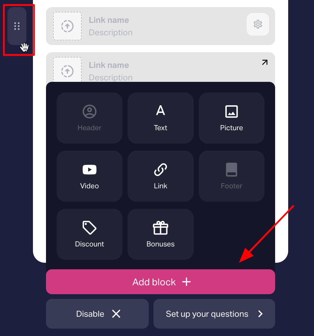 By clicking "Add Block", you select the option you need and drag it using the icon on the left to the desired location.