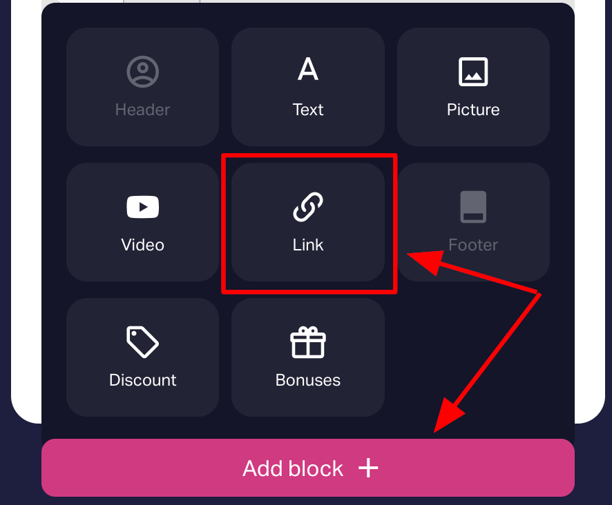 After adding the block, you need to specify its title and description. In the settings of the “Link” block, choose how it will be displayed — as a Button or as a Card.