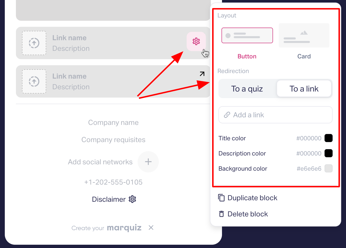 4. To set up redirection from Marquiz Pages, add a “Link” block