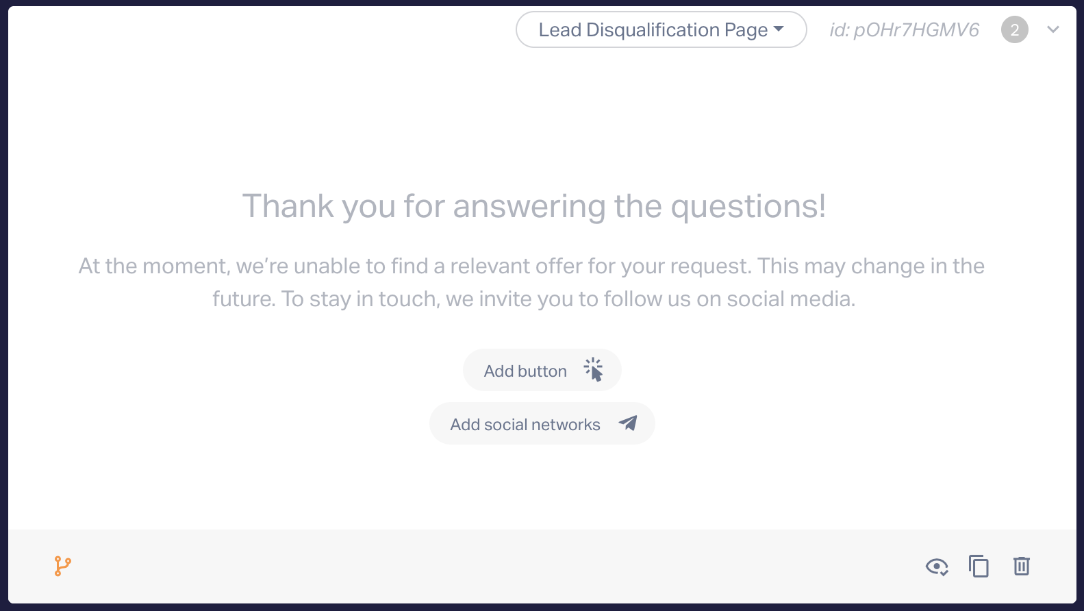 If the Lead Disqualification Page is moved to the first position (for example, after deleting previous blocks), it automatically switches to "Content" mode, its texts are cleared, and all branching conditions are reset.