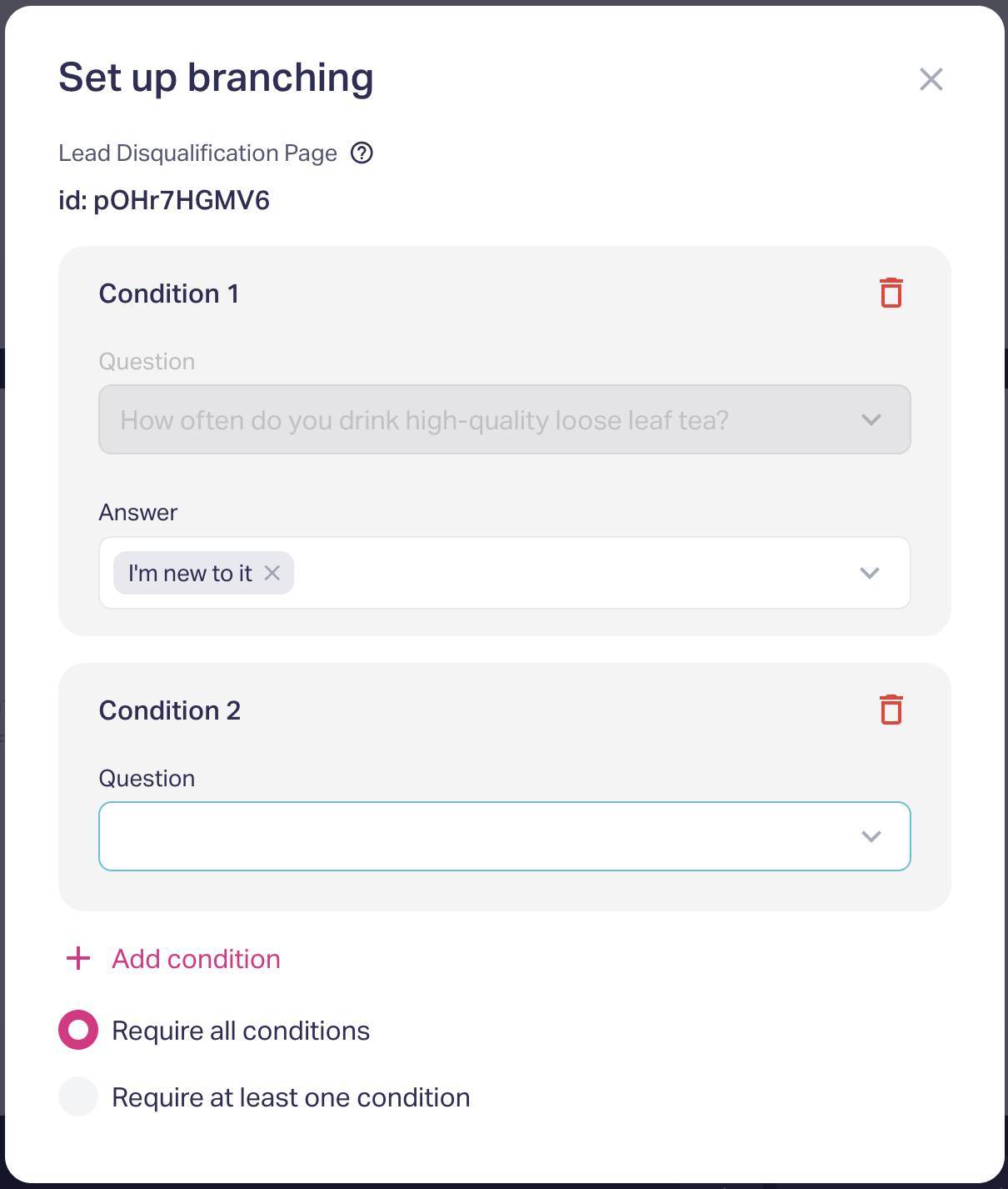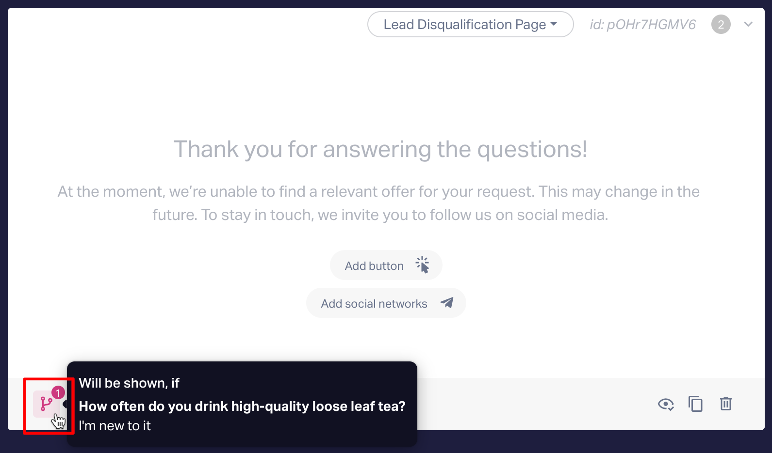 To make the Lead Disqualification Page appear, you must configure branching conditions.
