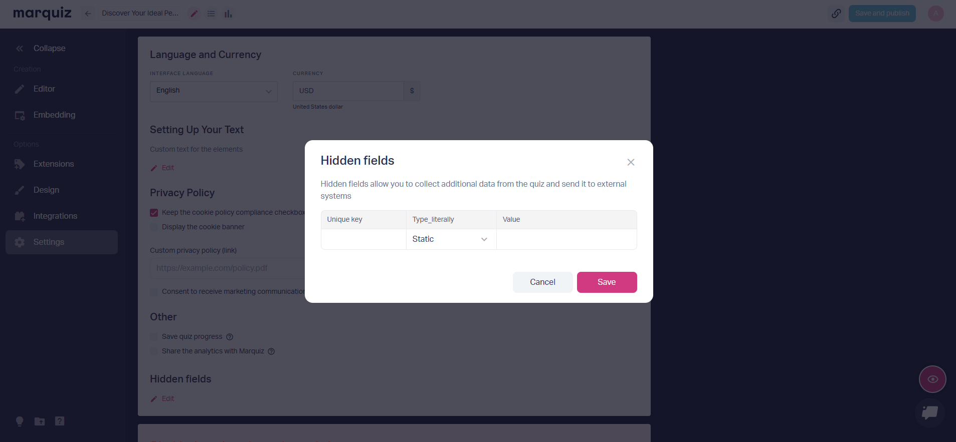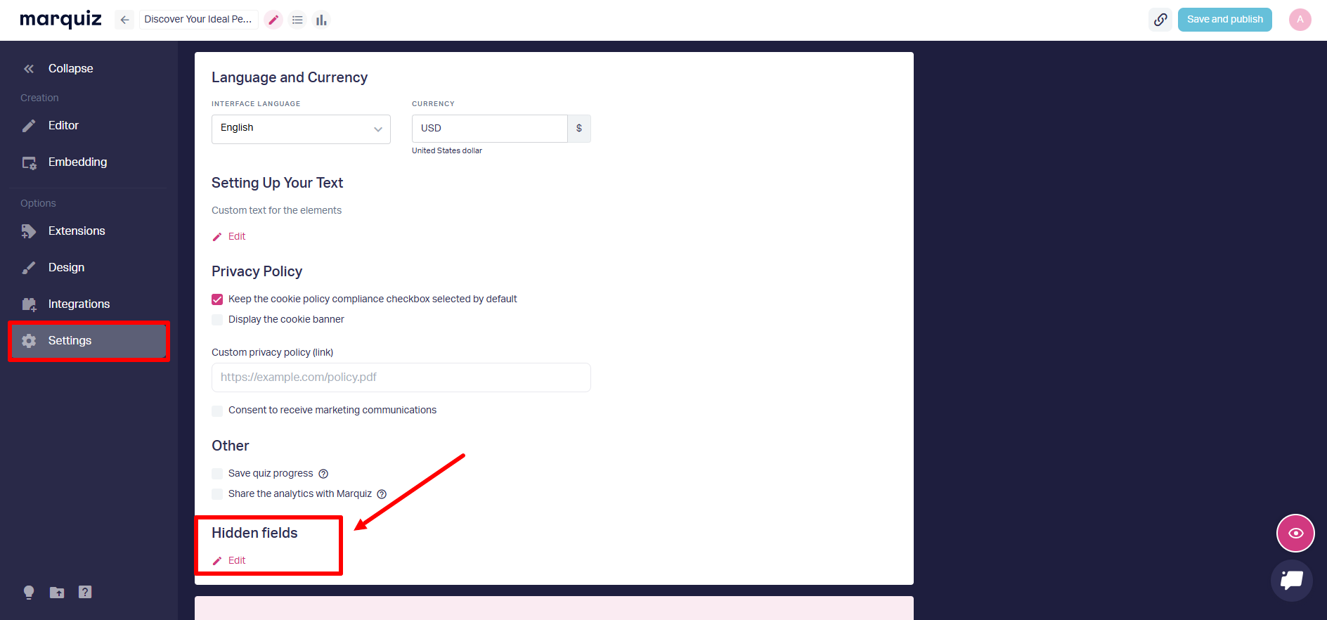 In the quiz editor, go to Settings → Hidden Fields → click Edit. A window will open for you to configure hidden fields.