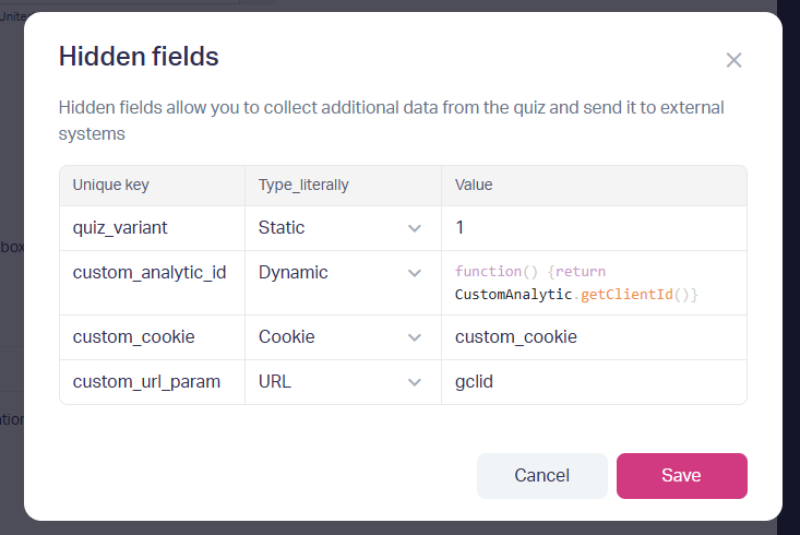 1. Unique key. Only Latin letters (A-Z, a-z), numbers (0-9), hyphens (-), and underscores (_) are allowed. For example: quiz_variant, utm_source