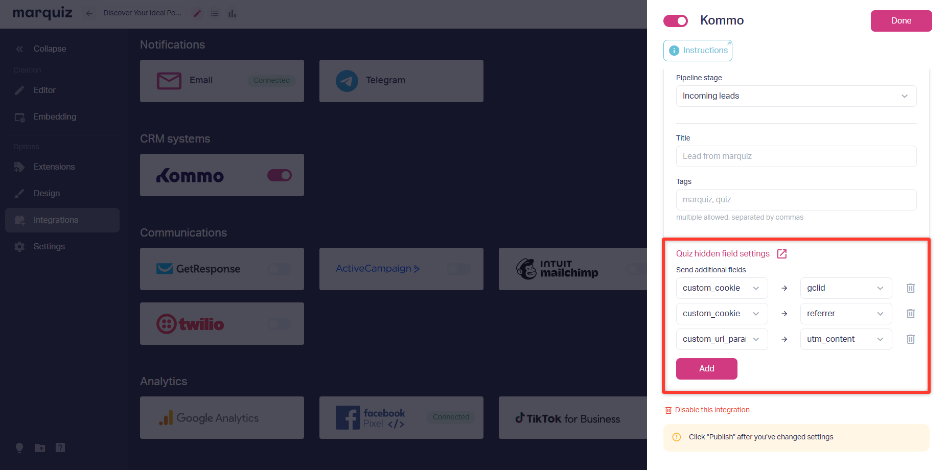 You just need to go to the right integration in the “Integrations” section, like Kommo.