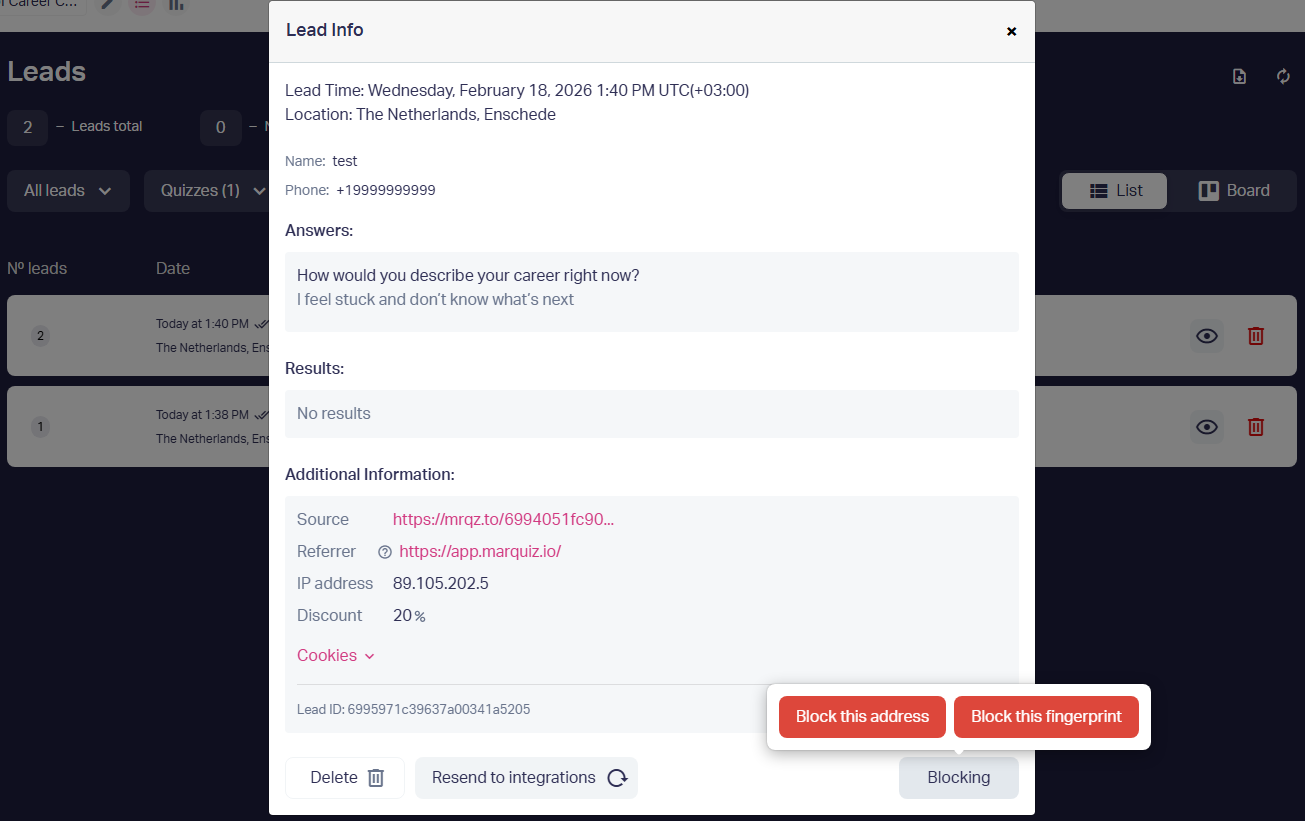 Now blocked users will not be able to send leads in your quizzes.